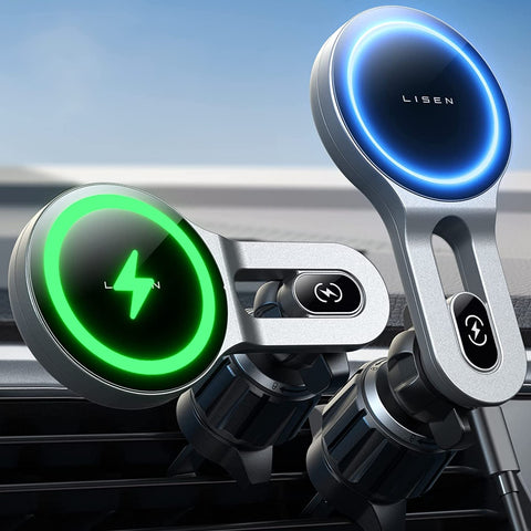 LISEN Magsafe対応ワイヤレス車載充電器は、最大15Wの急速充電に対応しています。様々な使用シーンに合わせて、2種類の取り付けアクセサリが付属しています。車の通気口またはダッシュボードに取り付けることができます。